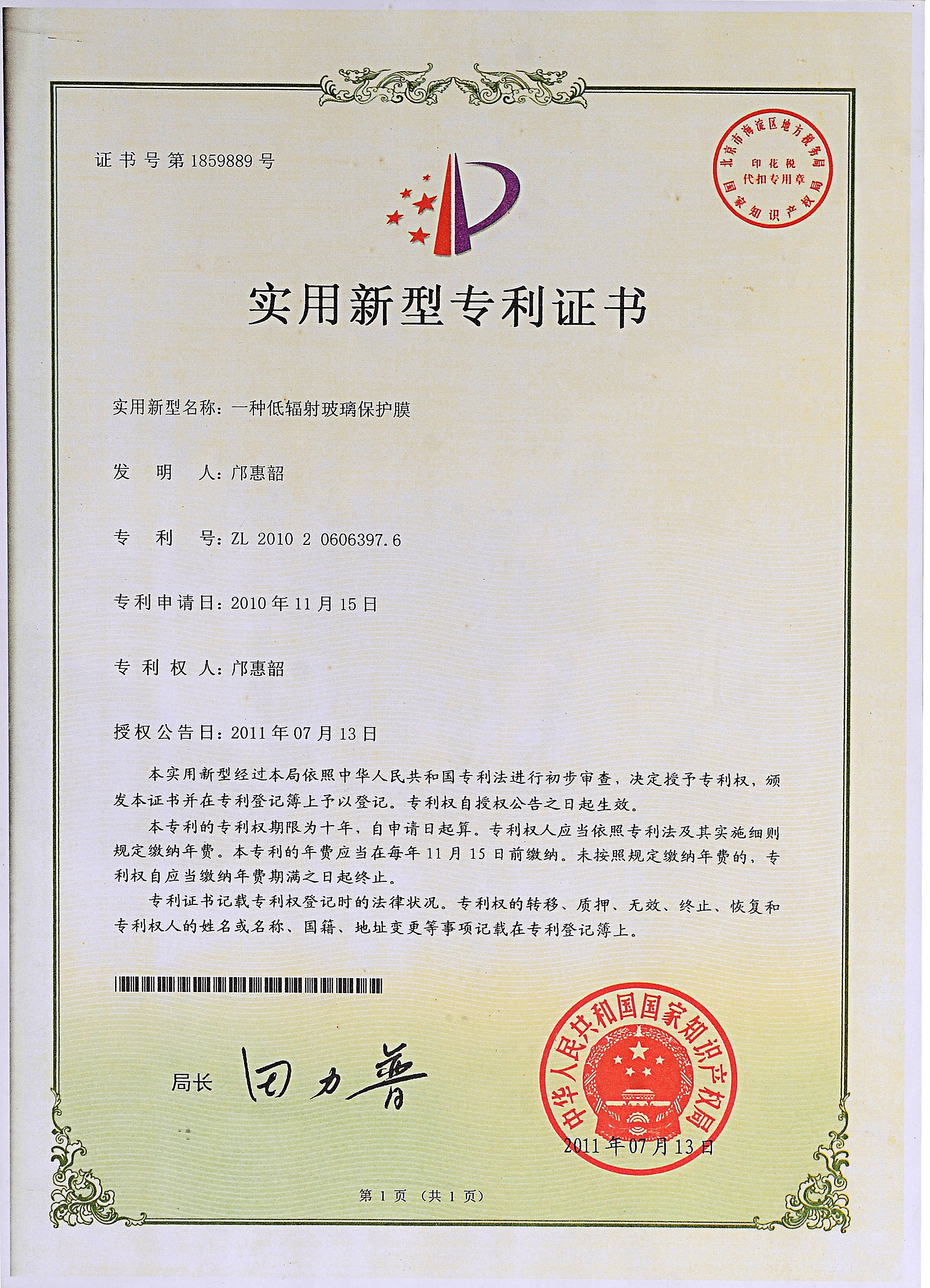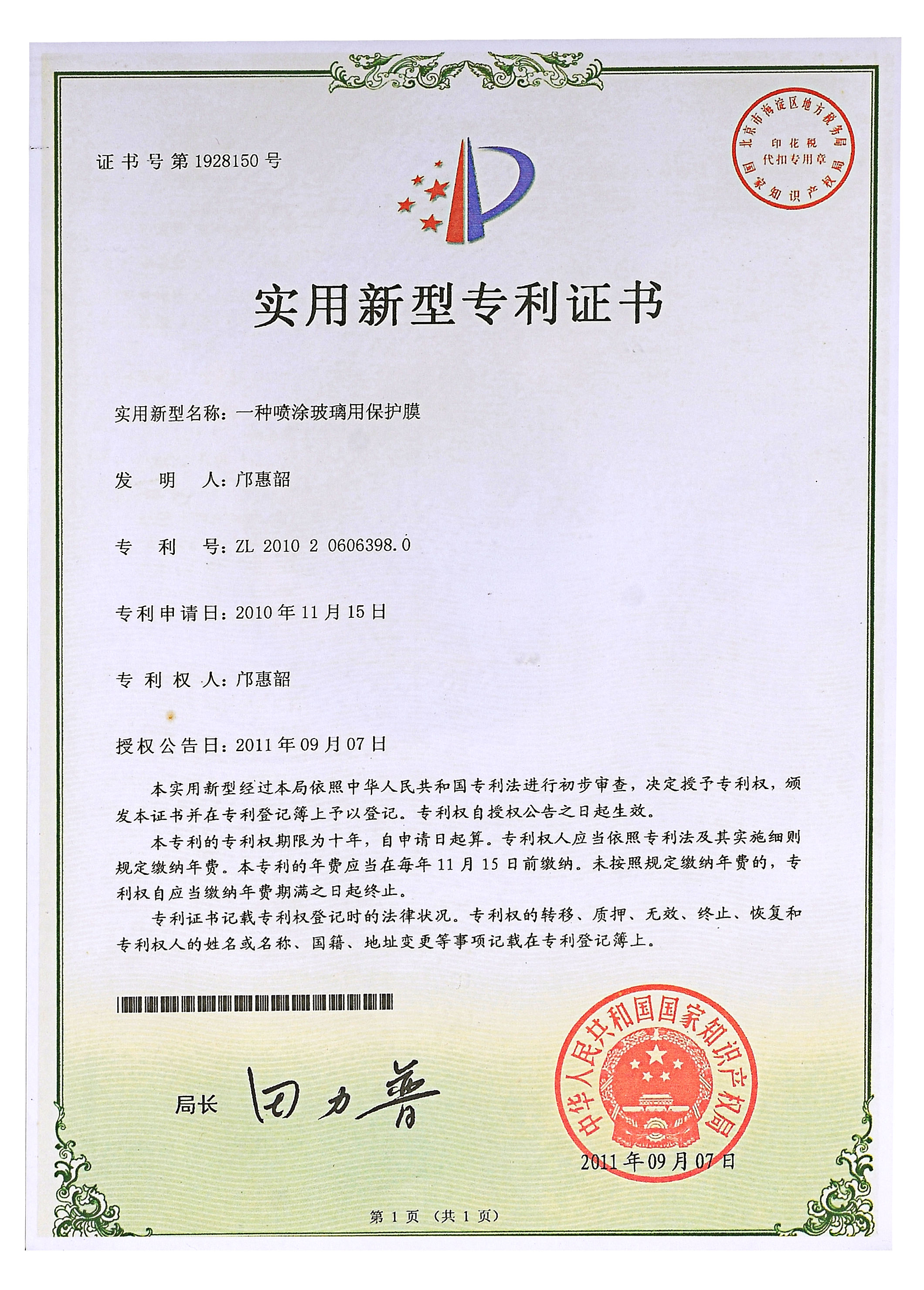 佛山分廠成立,中國(guó)第一臺(tái)超幅寬涂布機(jī)生產(chǎn)線投產(chǎn),并增添1臺(tái)幅寬2.8M的吹膜機(jī),專力打造原板Low-E玻璃保護(hù)膜成為中國(guó)第一膜,并獲得了實(shí)用新型專利證書。